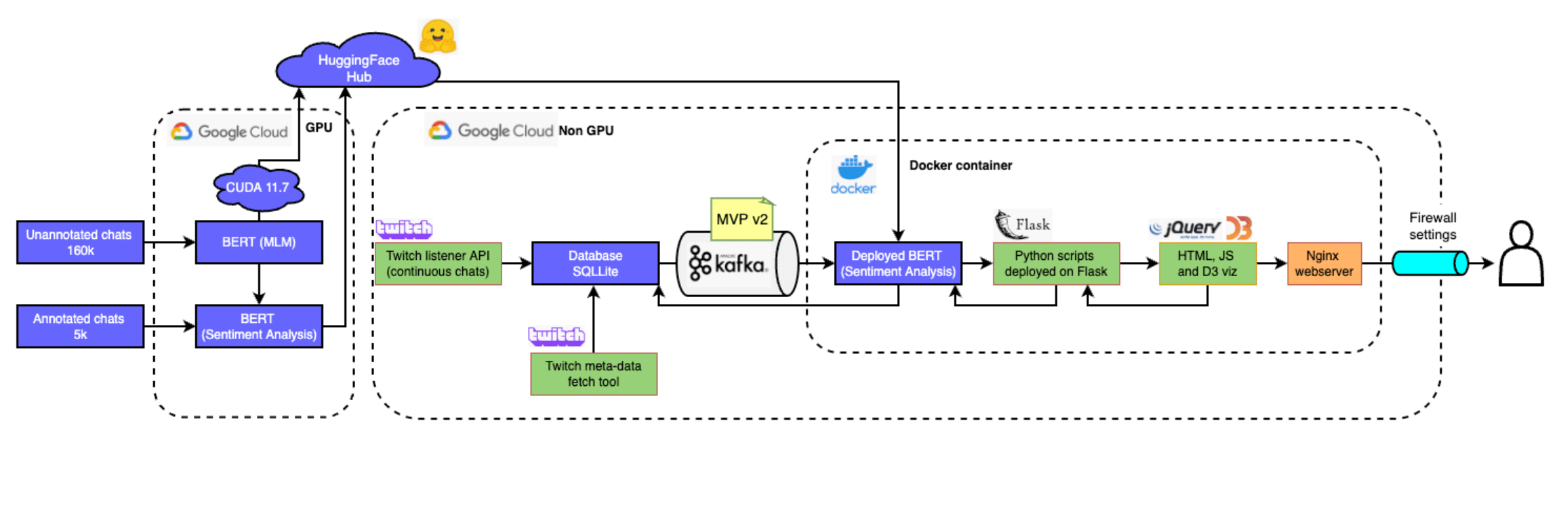 We used two different sets of google cloud platform (GCP) instances: (a) GPU based instance to train to BERT NLP models and (b) a non-GPU instance to host real time Twitch listener scripts along with the back-end webserver code. On the GPU layer, We used a double-fine tuning Transfer Learning approach to train a Base-BERT model with masked language modeling Sentiment Classification tasks using PyTorch and the Transformers library by Hugging Face.