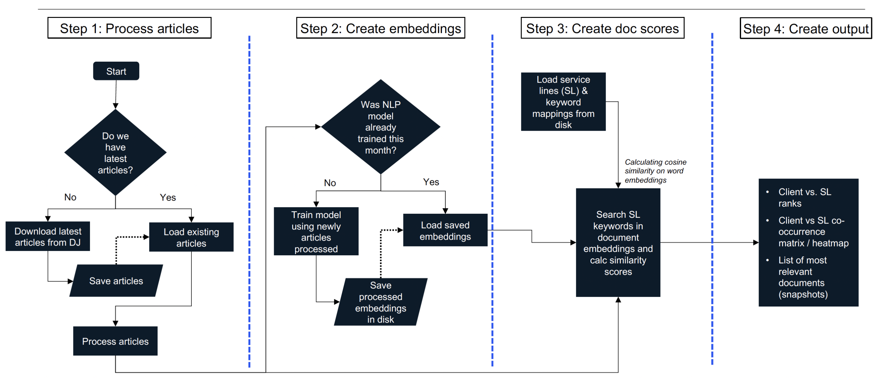 The idea here was to download news media articles from Dow Jones, and then classify those documents to a set a service lines offered by the company. Each service line was annonated by a set of keywords. The keywords were also encoded into vectors using the sentence encoder model and matched to the media article vectors using cosine similarity. In this manner, we were able to classify most recent news articles to their specific "topics" and make informed decisions.